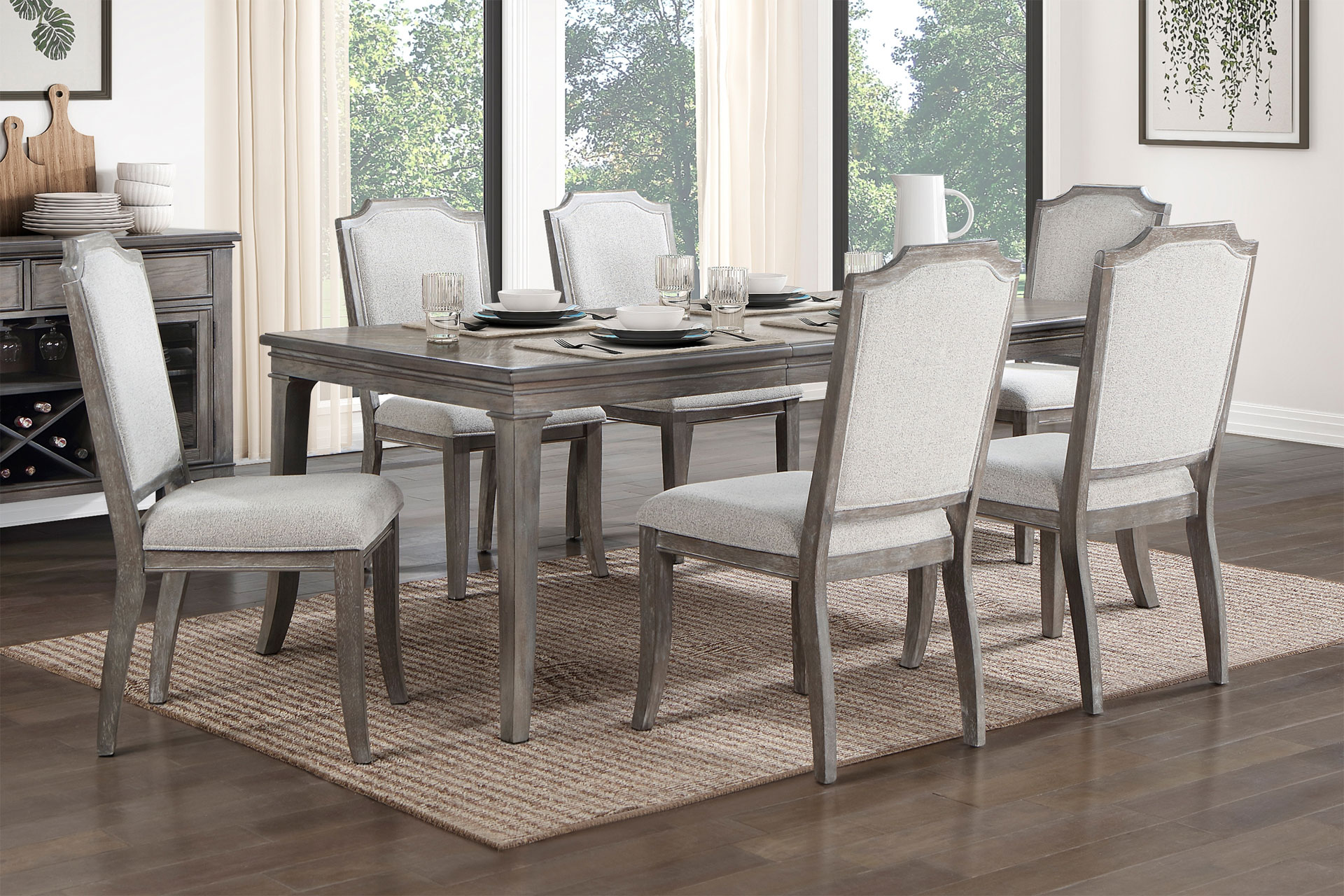 Traditional elements are paired in the design of the Garner Collection, the result – an elegant arrangement for your home’s casual dining room. A brown-gray finish highlights the distinct grain of the collection’s oak veneer, its hue creating a versatile pallet for your tabletop décor. Gray chenille fabric upholstery covers the seats and backs of the classic wood-framed side chairs. The server features antique pewter-finished hardware, wine rack, stemmed-glass rack, and behind-glass display storage, creating a functional service addition to your space.