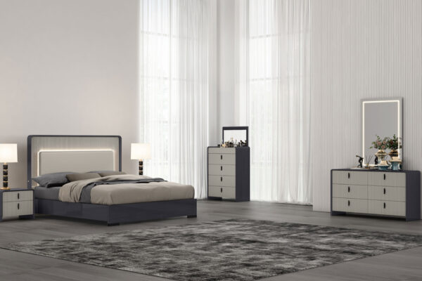 The Haven Bedroom Set is designed to bring a calming and modern aesthetic to your space. Featuring a clean-lined design in a soft grey finish, this set includes a panel bed, two nightstands, a dresser with mirror, and a chest. The padded headboard adds a subtle touch of texture and comfort, while the sleek hardware and minimalist silhouette make it easy to blend with any décor. The drawers offer practical storage for daily essentials, making this set as functional as it is stylish. Ideal for those seeking a peaceful, modern retreat with timeless appeal.