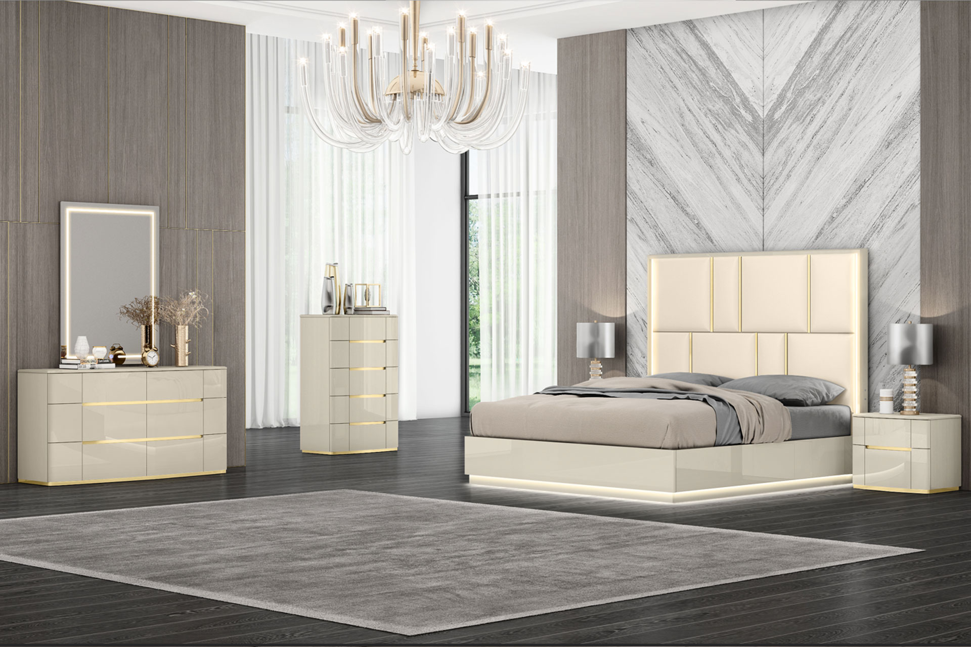 Elevate your space with the refined elegance of the Ivory Luxe Bedroom Set. This contemporary ensemble includes a panel bed, dresser with mirror, nightstand, and tall chest, all finished in a high-gloss ivory lacquer.The headboard features a soft, square-panel design for a stylish, upscale feel. Designed with smooth, easy-to-use drawers and a bright, elegant look, it’s a beautiful choice for any modern bedroom.
