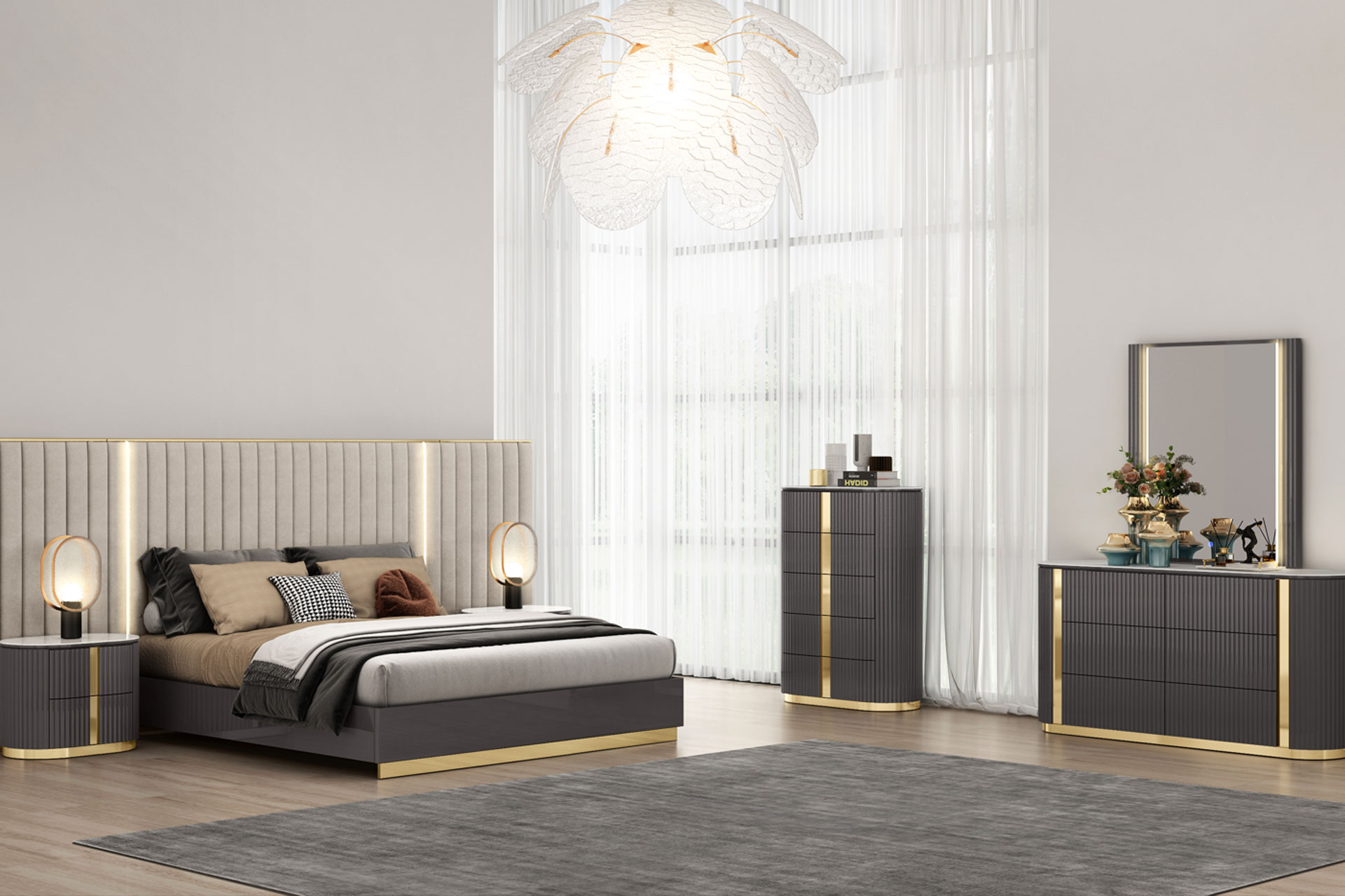 The Nova Bedroom Set blends modern sophistication with functional comfort. Featuring a platform bed, two nightstands, a tall chest, and a dresser with matching mirror, each piece is crafted with clean lines and finished in a rich matte charcoal tone with gold trim accents. The vertical headboard adds a luxurious touch, while the lighting enhances ambiance and style. Sleek hardware and soft-close drawers provide practical storage and a seamless look. A striking collection designed to bring a bold, contemporary edge to your bedroom.