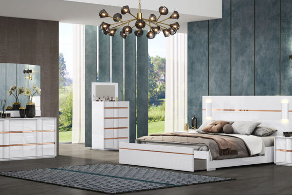 Brighten your space with the sleek, modern look of the Solara Bedroom Set. Featuring a clean white high-gloss finish with chrome accents, this set includes a platform bed with LED lighting, two nightstands, a dresser with mirror, and a chest. The bed’s contemporary headboard design is both stylish and eye-catching, while all case pieces offer smooth, soft-close drawers for easy organization. Reflective surfaces and minimalist lines make this a perfect fit for chic, modern interiors looking for a bold upgrade.