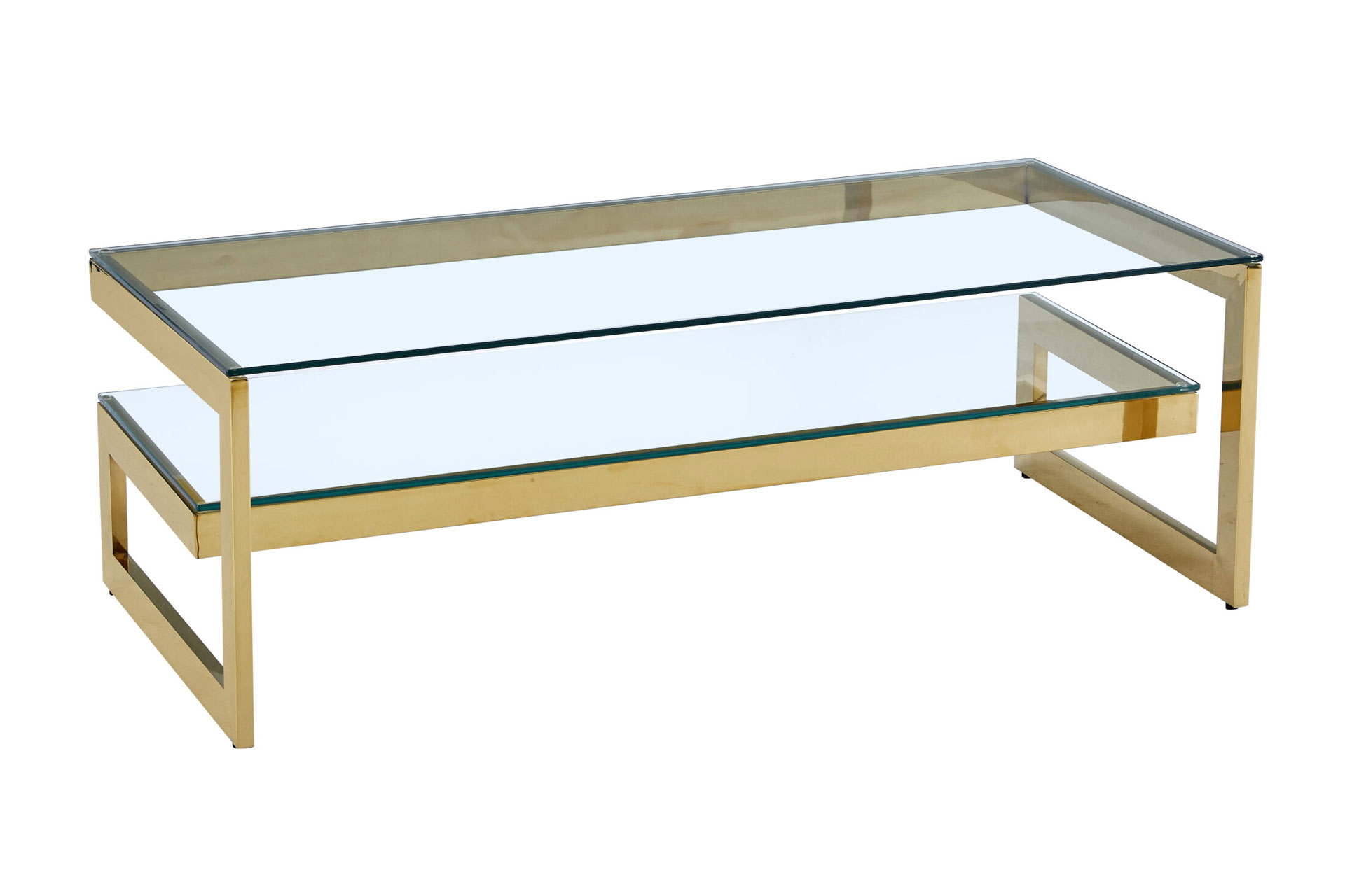 This modern coffee table pairs a gold-finished metal frame with dual glass surfaces, offering both elegance and practicality. The clean lines and open structure give it a contemporary edge, while the lower shelf provides extra display or storage space. A versatile choice for stylish living areas.