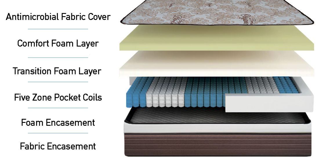 One of our signature series mattresses, the Majestic is made from a five zone pocket coil base with a foam encasement. The four inch real pillow top is made from a bamboo and silk thread infused fabric, and the quilting contains a soft filling. Quilted borders and an embroidered label complete the premium look and feel of the mattress.