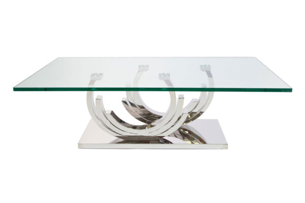 Graceful and striking, this table features an artistic chrome base with curved, intertwined forms that create visual movement. Topped with clear tempered glass, it offers a light and airy feel while remaining bold in design. A great fit for rooms that lean into luxury with a creative twist.