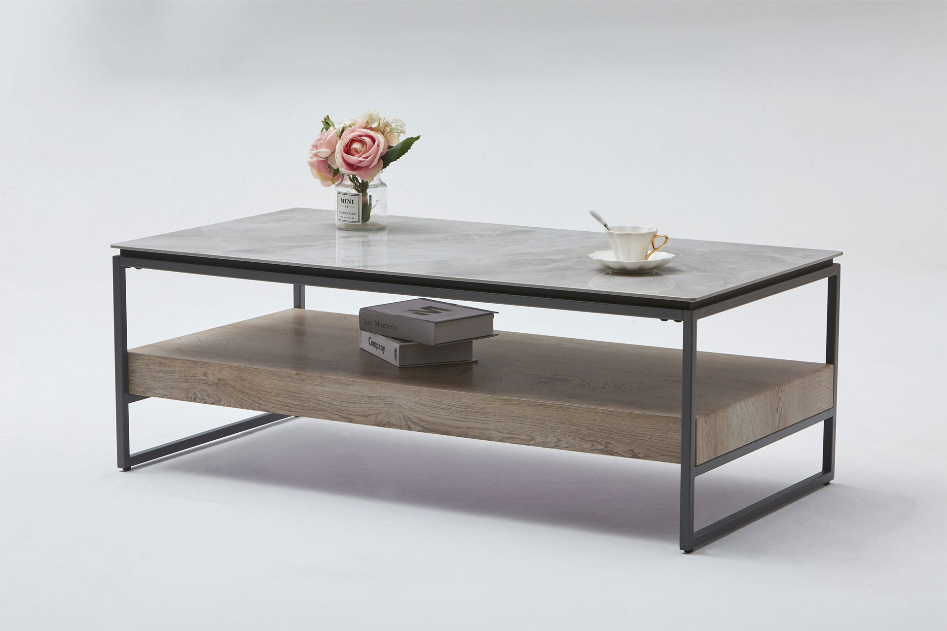 This coffee table blends modern simplicity with warm, natural tones. It features a stone-inspired surface paired with a black metal frame and a lower wooden shelf for added storage or display. Practical and stylish, it’s ideal for casual contemporary spaces.